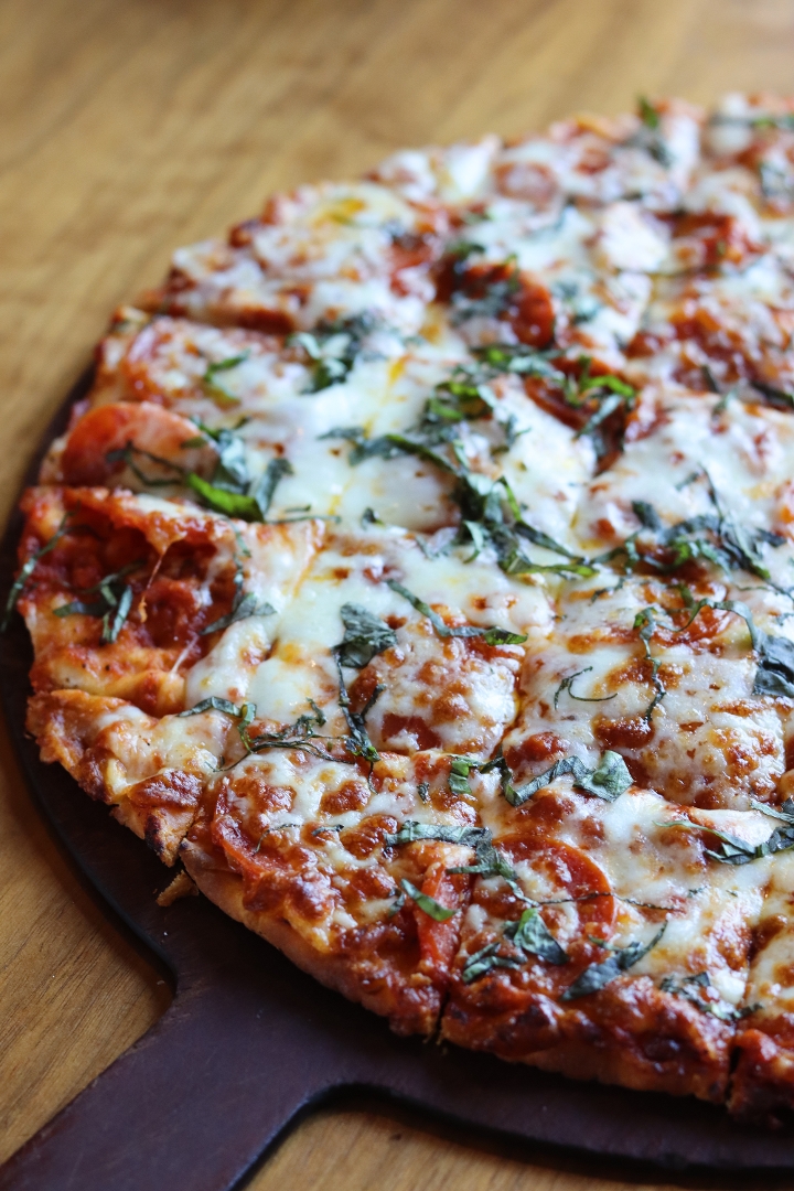 Sliced pepperoni, 5-cheese blend, marinara sauce, & basil chiffonade.